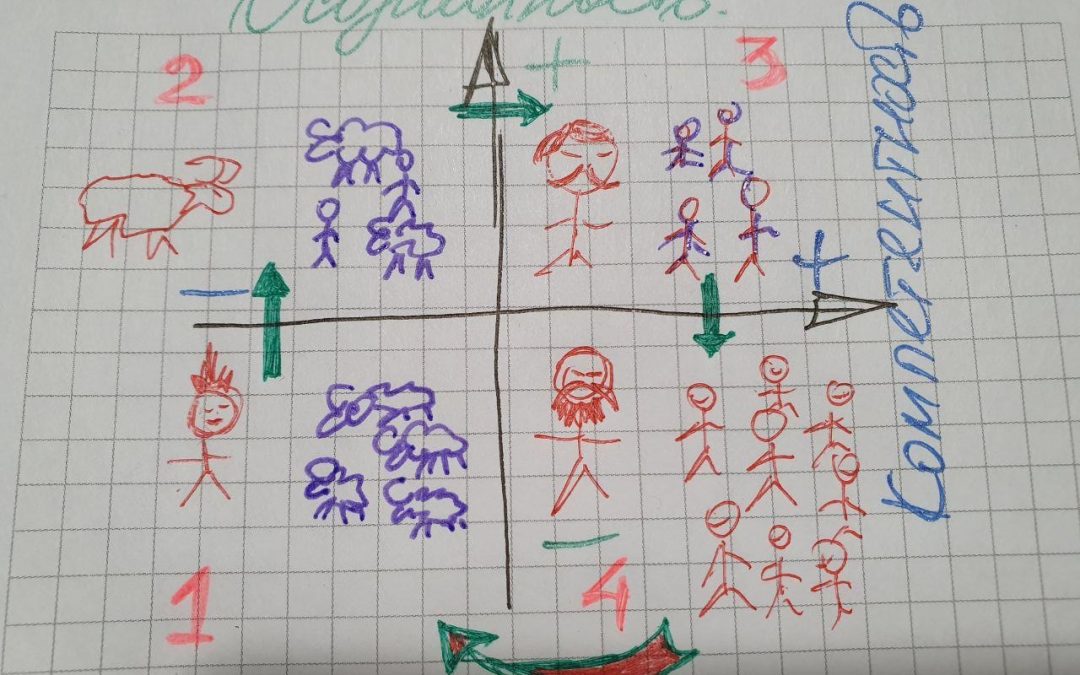 Так, незаметно, наш герой снова пришёл в квадрат 1. Пора начинать ему новый путь по тем же квадрантам, но уже на более сложном уровне. Это не круг, а рождение спирали.